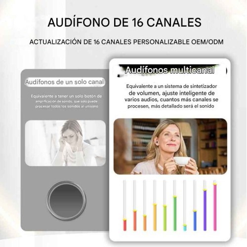 Equipados con un avanzado sistema de 16 canales digitales, estos audífonos ofrecen una calidad de sonido superior, adaptándose a tus necesidades auditivas en cualquier entorno.
